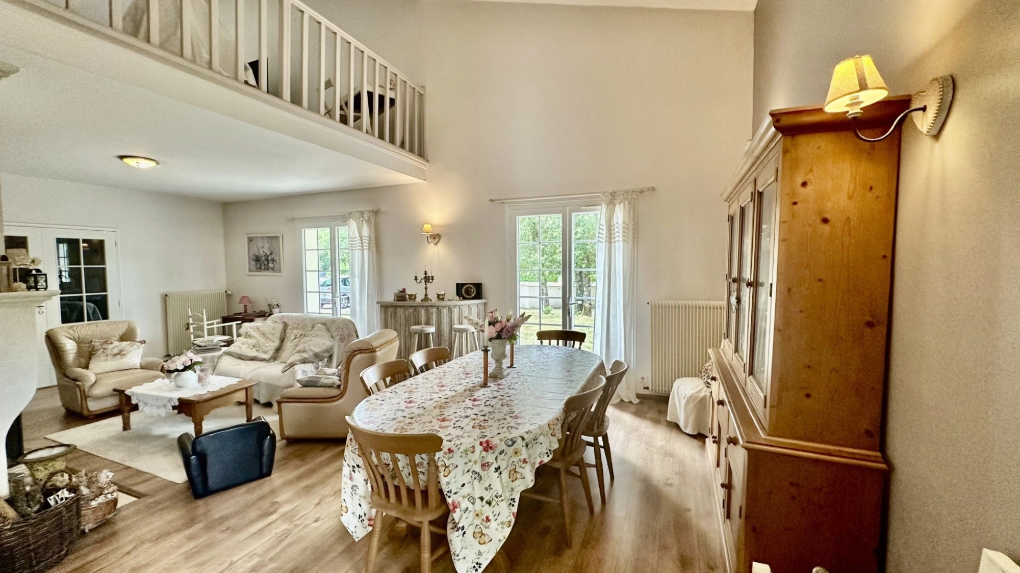 Les espaces de vie sont nombreux et conviviaux : un grand séjour salon lumineux avec sa cheminée, une cuisine équipée avec un cellier attenant, et une superbe mezzanine aménagée idéale pour un espace de travail ou de détente.
