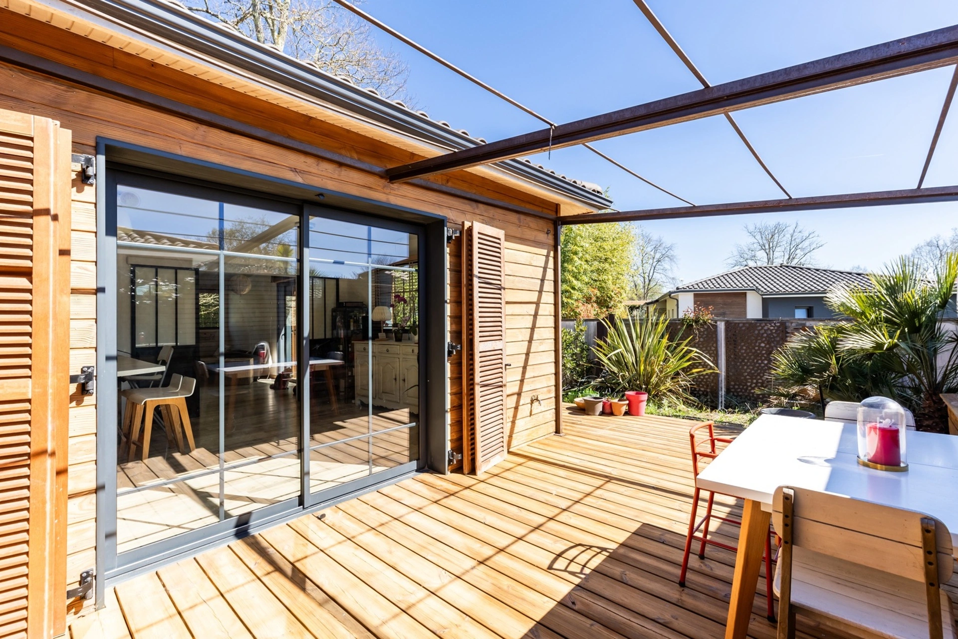 Depuis le salon comme depuis la cuisine, vous accédez directement à une belle terrasse bois, idéale pour profiter du jardin toute l'année.